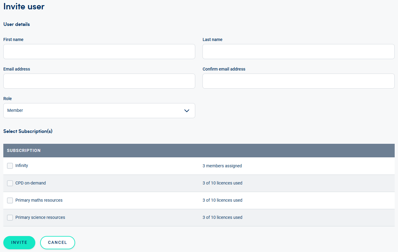 - Complete member details, select the correct role type, and tick any subscriptions that this person will require access to. When you're happy that the details are accurate click 'INVITE '.